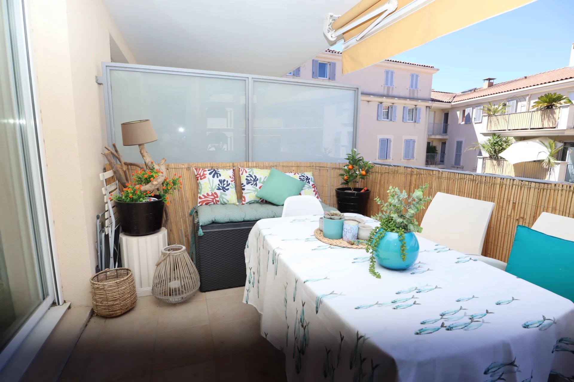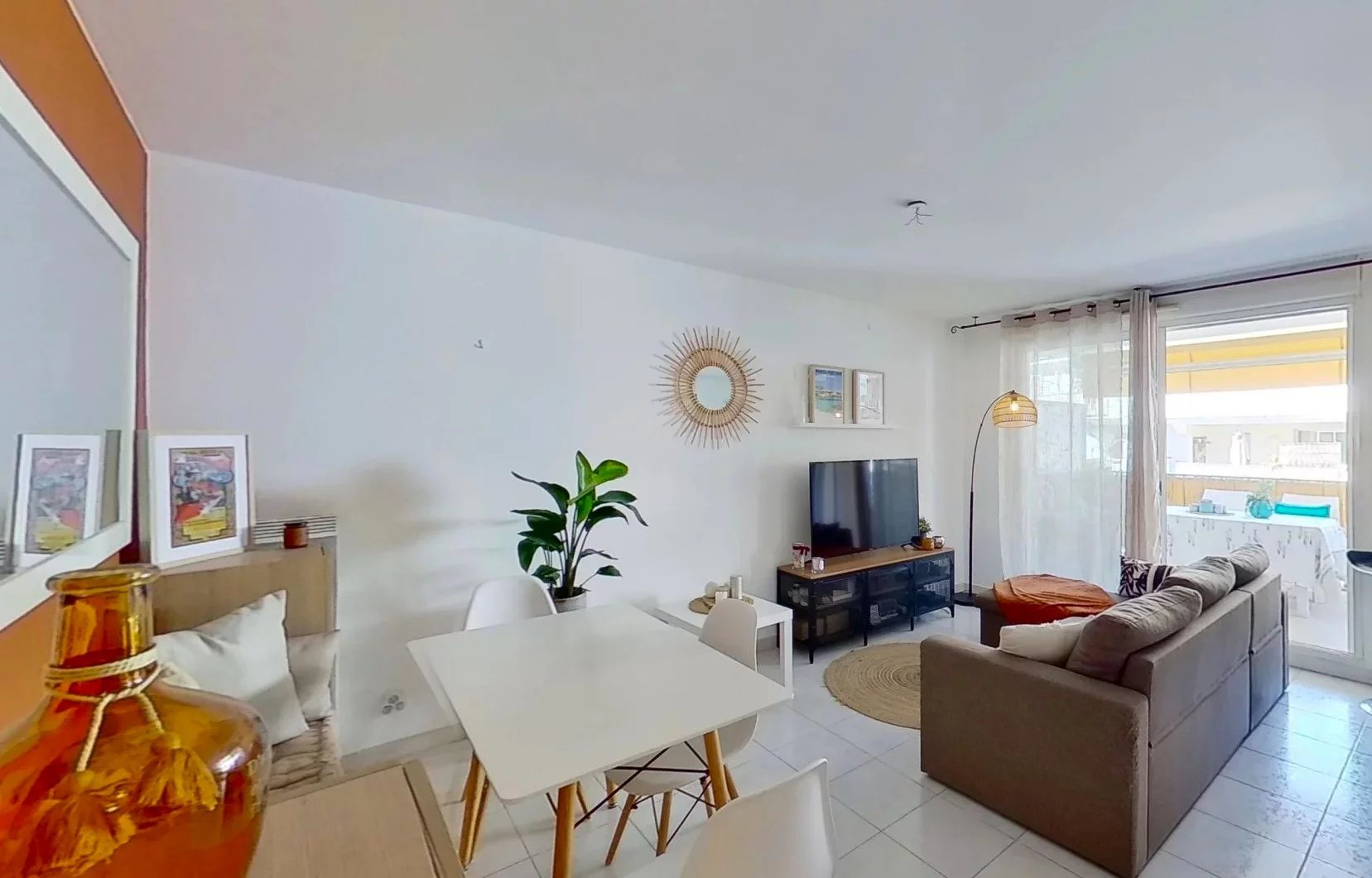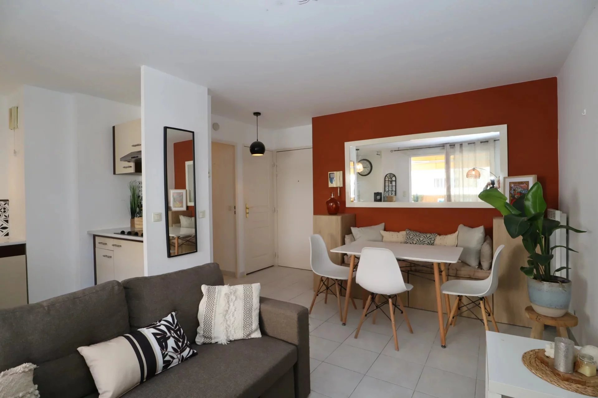 L’appartement se compose d'un séjour lumineux exposé Ouest avec placard à l'entrée, une cuisine américaine aménagée et équipée, ouvrant sur une terrasse de 8,46 m² donnant sur l’intérieur d'un magnifique patio à l’abri de toute nuisance sonore.