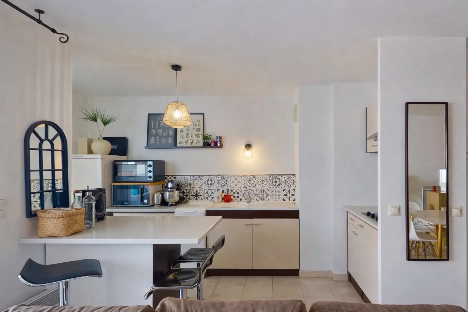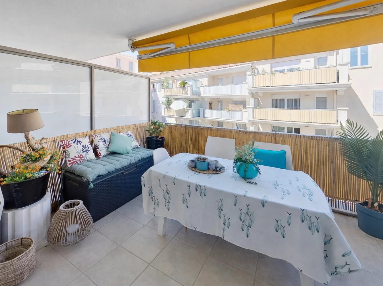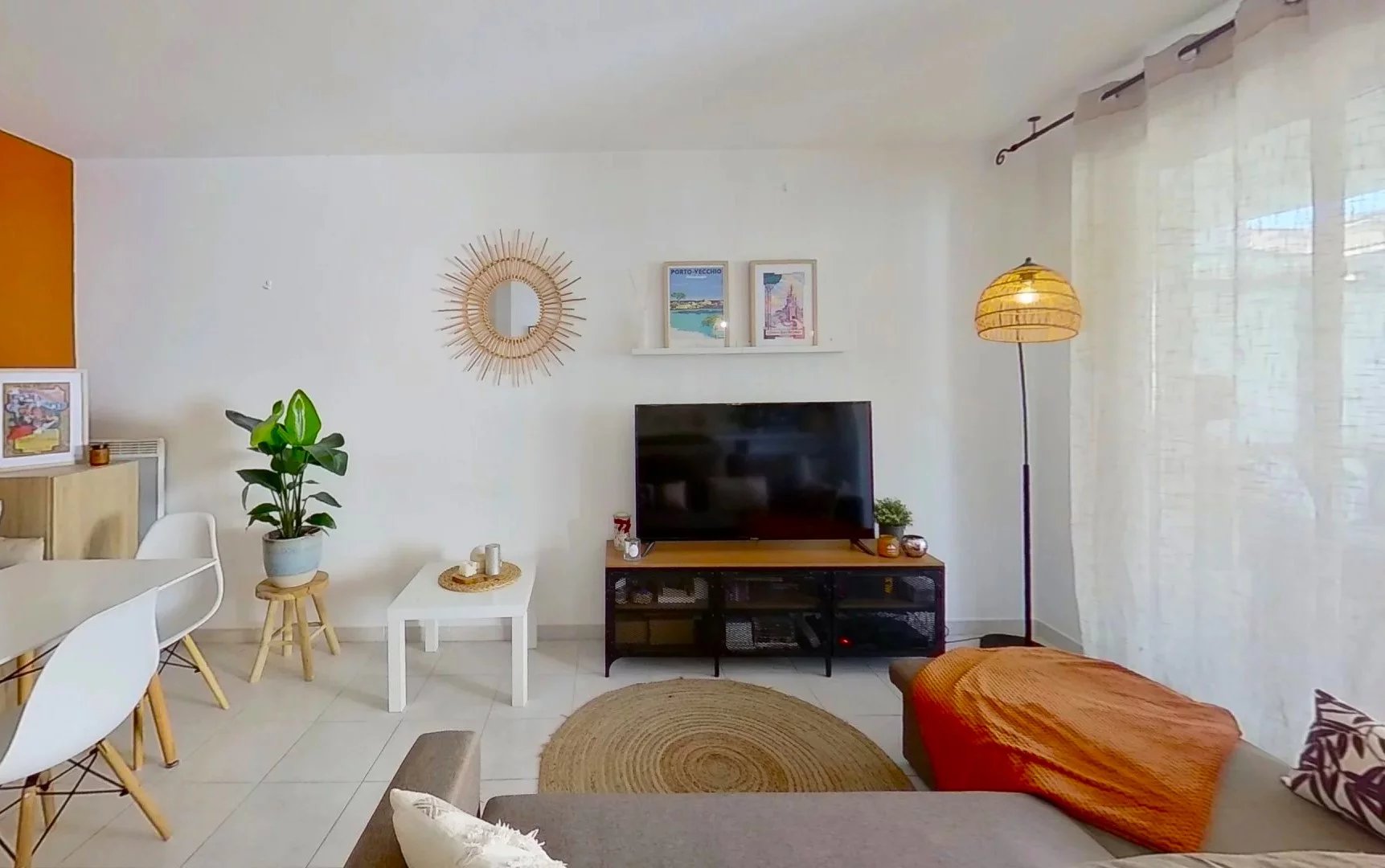 L’appartement se compose d'un séjour lumineux exposé Ouest avec placard à l'entrée, une cuisine américaine aménagée et équipée, ouvrant sur une terrasse de 8,46 m² donnant sur l’intérieur d'un magnifique patio à l’abri de toute nuisance sonore.